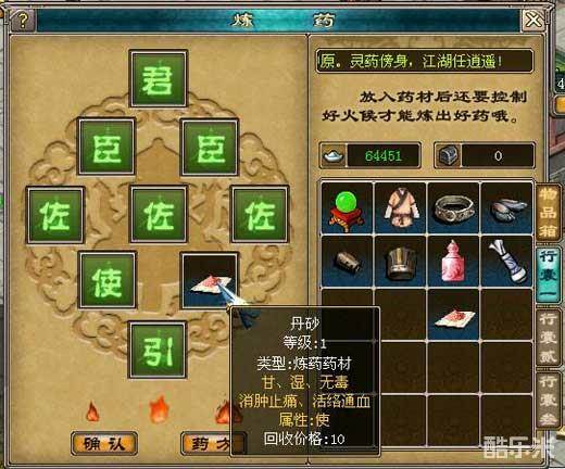 点击炼药之后按顺序放入君、臣、佐、使、引五类共九味药材,然后点选三种火力按钮选择火候。这时候点击确定,就会在药香四溢之后看见由玩家自己炼制的相应药品。不同等级的药材,搭配不同性质的药方,乃至细微的火候差异,都会得到不同的炼药结果。哪怕是某一次的试验没有成功,也是一次有趣的药学实践。