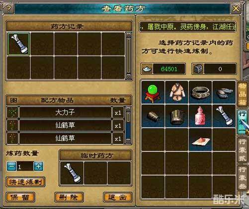 为了方便玩家炼制自己最合用的药品,而不需花费不必要的脑力去记忆各式各样的药方。点击“药方”按钮可以打开之前使用过的炼制记录。这里自动保存了最近几次的成功炼药记录,点击“保留”可以就将其中六个保存到药方记录中,以后点击药方记录中的药品再点击快速炼制,输入要炼制的数量,只要你的行囊里药材足够,就可以瞬间炼制出药品。百试百灵哦。