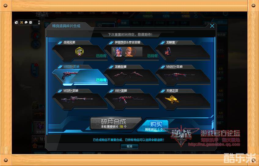龙鳞武器只在精良道具碎片合成池合成获得,每个碎片商城售价为500NZ一个,如果一次购买5个2500NZ就可以使(500NZ折扣卷)相当于每个碎片400NZ,前提是玩家需要有足够的500NZ点折扣卷。按照整个合成池来算,如果在精良碎片合成池,还没有合过的玩家,一把枪价格是60元-156元之间,价格相对来说比较便宜,当然这还得看个人喜好,是否喜欢龙鳞武器系列,游戏消费需理性,土豪喜欢收藏的那就直接无视吧!