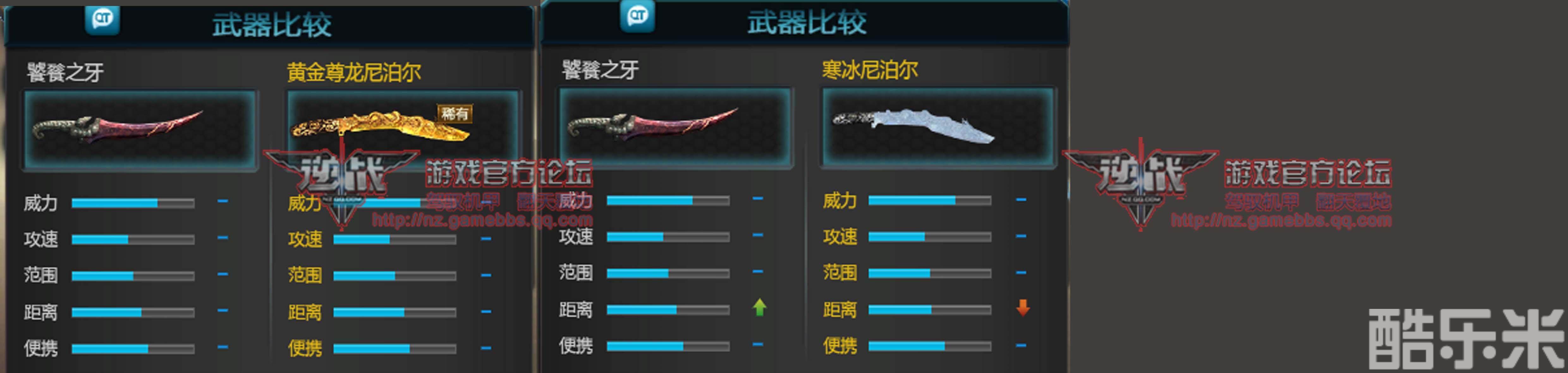 我们再来看看饕餮之牙与各类尼泊尔相比的数据。和黄金尊龙尼泊尔相比,在威力、攻速、范围、便携、距离上数据面板的比较均持平。而与寒冰尼泊尔相比,除了距离要长出寒冰尼泊尔一些外,威力、便携、攻速、范围均持平。