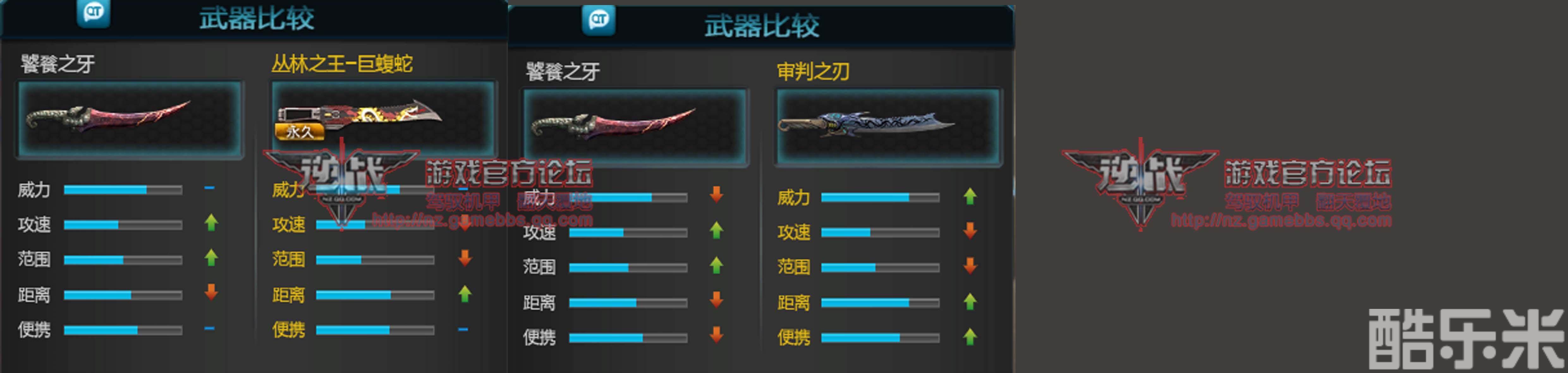 再来看看与丛林之王系列相比,看看大砍刀与饕餮之牙比较结果如何。与丛林之王-巨腹蛇相比,威力方面两者持平,攻速方面饕餮之牙要优于丛林之王-巨腹蛇,攻击范围方面同样如此,饕餮之牙在攻击距离方面要弱于丛林之王 -巨腹蛇。便携程度两者持平。与目前逆战最长的到审判相比,威力自然落后,不过攻速和范围还是占优势的,其他方面均落后与审判之刃。