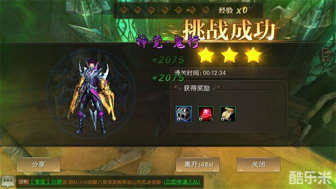 挑战成功之后,页面会有提示,显示取得的成绩、通关所用时间以及获得的奖励,其中七杀宝箱可以开出价值不菲的物品哦。
