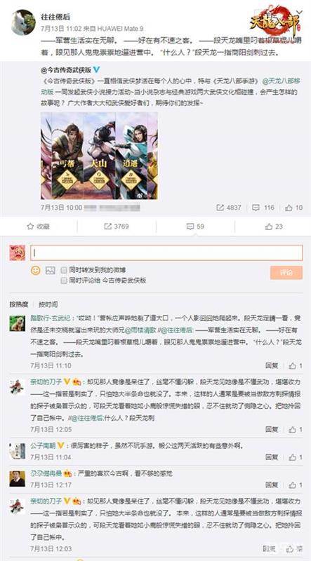 在活动对应的微博下面,大家已经迫不及待的开始了故事接力,更有多位知名的武侠作家加入到活动当中。包括武侠奇才时未寒,大陆新武侠公认的武侠天才小椴,很多人是因为他才认识并喜欢上大陆新一代武侠的。其代表作有《乱世英雄传》和《长安古意》《开唐》等,在他续上的故事片段中,段天龙偶然在军营中撞见了鬼鬼祟祟之人,并与之交手。此外还有如亲切的刀子、侠说八道、王泡小泡、管平潮、楚惜刀、王晴川1228、万小刀、春十三香、木剑客、君天、真正碎石、春水无觞、踏歌行-玄武纪、竹喻枫等,均有在这场声势浩大的天龙故事接力活动中书写上精彩的一笔。
