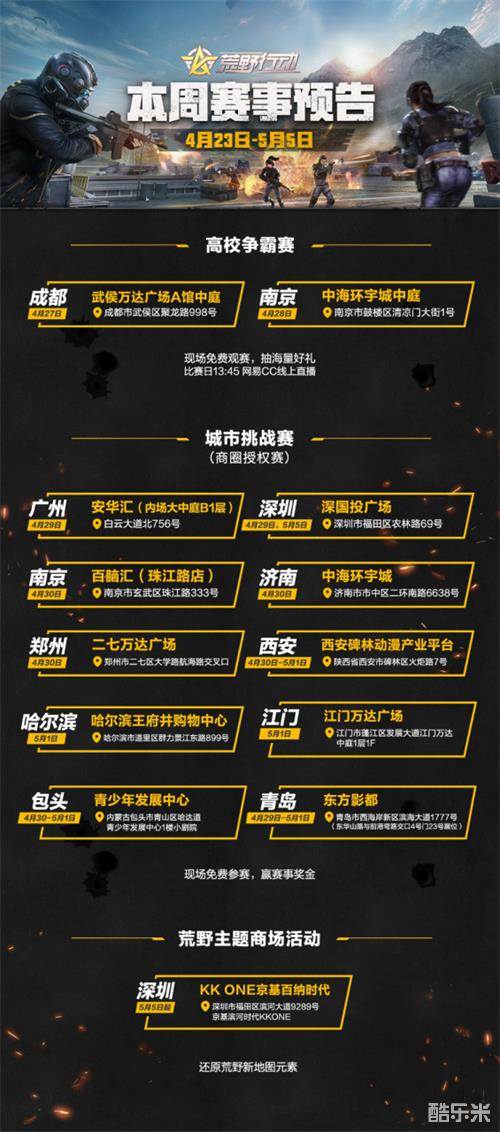 作为《荒野行动》官方授权的商圈赛事,城市挑战赛将在五一期间落地全国10座城市,其中包括广州,深圳,南京,济南,郑州,西安,哈尔滨,江门,包头和青岛。从最南端的深圳站到最北端的包头站,几乎纵跨半个中国,如此大手笔的投入旨在为全国热爱《荒野行动》的玩家打造一个线下开黑聚会的赛事舞台。与此同时,城市挑战赛没有任何参赛门槛,凡是年满16周岁的玩家均可来到现场免费报名参与,除了摘得比赛名次获得赛事奖金外,还可以参与现场的海量抽奖活动。有了此等福利,还需要什么诗和远方。