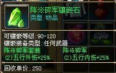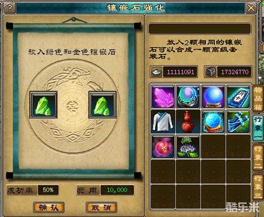 2个绿色镶嵌石有50%的概率强化为一颗金色镶嵌石,合成费用为10000游戏币;