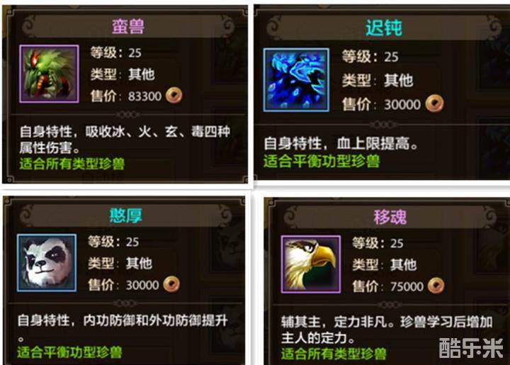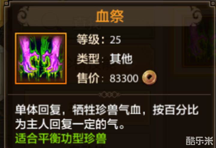 3、珍兽技能选择解析:血迹,损失珍兽自身血量,按百分比为主任恢复一定量的气,在副本中峨眉这个门派气不够用是常事,这个技能可以快速大量补充少侠的气,解决了少侠在副本中因为气不够用所导致没办法给队友加血的状况。迟钝,增加珍兽自身血上限,使血迹这个技能为少侠补充更多的气。蛮兽,增加40%的冰玄火毒属性抗性,防止珍兽血量不足,从而导致血迹技能无法给少侠提供足够的气,移魂,增加主任定力,定力属性就是少侠的气上限,拥有足够的气上限,才不会出现副本中给队友加血气不够的现象。憨厚,增加珍兽内外防御,减少了少侠珍兽在副本中被怪物消耗的血量。