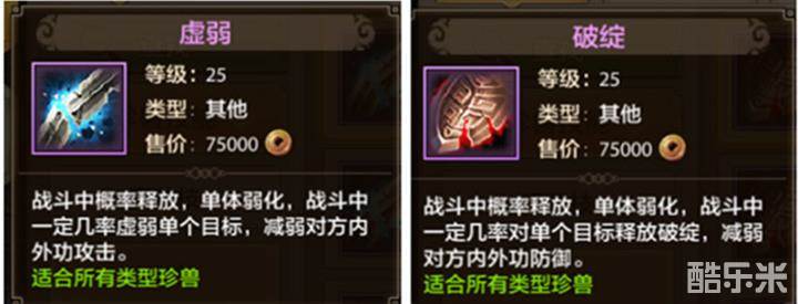 3、珍兽技能选择解析:在经济型少侠珍兽技能选择的基础上。增加虚弱,单体弱化,一定几率下减少目标内外攻击。在副本中,最难解决的就是BOSS,峨眉作为队伍里的辅助,要帮助队伍中各个少侠,使BOSS对各个少侠的内外攻击减少,这个技能必不可少。破绽,单体弱化,一定几率下减少目标内外防御。帮助了其他少侠减少了BOSS对于他们的伤害,那帮助快速解决战斗也是必修课之一,降低BOSS的内外防御,让其他少侠的输出更多,这样才算得上一个团队中完美的辅助。
