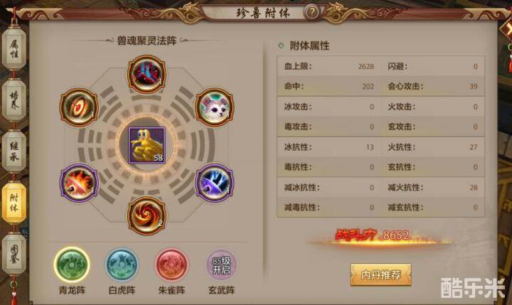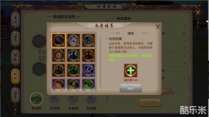 珍兽达到55级可以附体在阵眼中,珍兽等级、资质、成长率、悟性越高,激活内丹的效果越好。根据需要选择合适的珍兽,选择想要附体的珍兽,可以看到附体效果。点击法阵中空置的内丹位可以将拥有的内丹镶嵌上去。点击已经镶嵌的内丹,可以使用相同内丹提升等级或者遗忘。阵眼无珍兽或者将珍兽分离,内丹无法发挥效果,内丹发挥的效果也与珍兽息息相关。