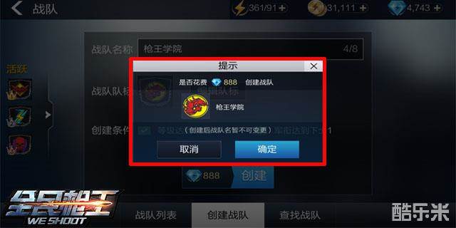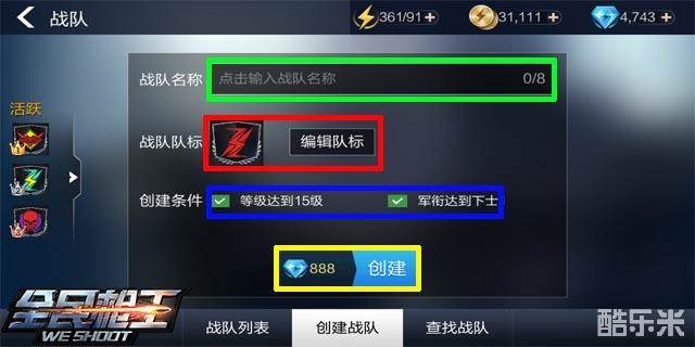 如果你想带领你的兄弟朋友们一起PK、闯关,那么你就应该创建一个战队来带领大家走向辉煌。那么创建战队需要注意哪些事项呢?注意的是挺多,首先你的等级及军衔都得达到一定要求才有资格创建战队。等级:15;军衔:下士1,这就是要求,除此之外,就是资金要求,需要888钻石。还有创建战队需要做好心里准备,毕竟管理一个战队并不容易。