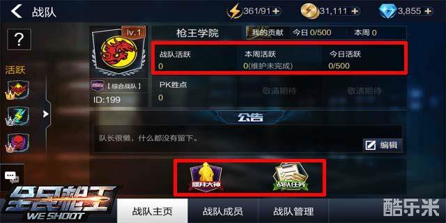 战队也有了,人也招了,接下来就是管理战队了。战队管理是一件很不容易的事,战队目前有队长和副队长两种职位,队长可以转让,副队长由队长任命,且副队长的名额随战队等级提升而增加。队长拥有入队审批、改公告、战队设置、成员管理、解散战队等所有权限,而副队只拥有前两个权限。这些管理主要使用的就是前四个,而成员管理中的任命副队和踢人就需要对每个人的贡献来决定了。
