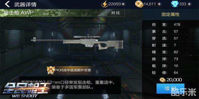 AWP这把枪也是游戏中三大新手枪械之一,或许这也说明了狙击枪在游戏中的重要性。这把枪获取上同样可以先支付2万金币来练练手之类的,毕竟作为新手枪械,它的属性及性质就限制了它在游戏中的发育,不过就论练手、熟悉狙击模式还是很有用的,毕竟没人一开始就拿把好狙在非单机模式中毁自己的战绩,所以说拿这把AWP在单机中熟悉熟悉,自己并研究下是用辅助开镜好,还是用新版推出的一键开镜好。