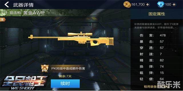 黄金AWP是一把特殊的枪,对大家的实用性上还是很低的,他作为黄金家族的一员,特殊及尊贵就降临了在它身上,现阶段只能从七天豪礼中获取,其他获取途径就只能等候了。所以说,有机会拿到这把枪的时候还是好好用用,它的属性方面还是很好的,射速的提高,载弹的增加,都对击杀过程提供了便利。