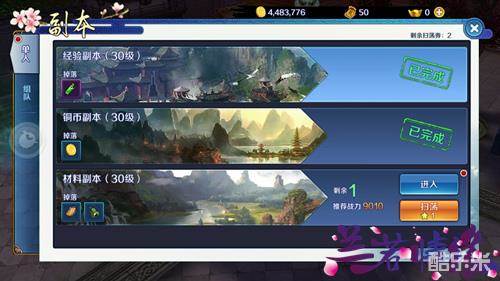 当你的等级达到30级,材料副本会自动开启。与其他功能不同,材料副本是不需要跑地图的,无论你现在在何地,只要点击前往,就可以原地传送进入副本。材料副本产出供仙翼升星的飞升符和供仙宠升级的经验丹。