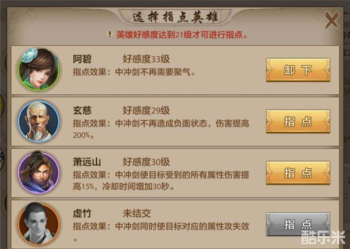 6、中冲剑(公测后优化):这是一个比较强大的技能,公测前指点可以是随机使目标抗性失效持续10秒但在实战这并不稳定,因为一旦和你主属性不符的属性失效并不会增加伤害。公测后,中冲在solo的情况下打没有被自己抗死的对手,虚竹的指点是最好的选择,打峨眉也可以选择玄慈指点配合指点江山和百步穿杨一套打出伤害打出优势。打近战可以选择阿碧更好的放风筝。打群架建议选择萧远山,因为指点效果可以放大所有人对目标所造成的属性伤害且可以和暗器技能配合。