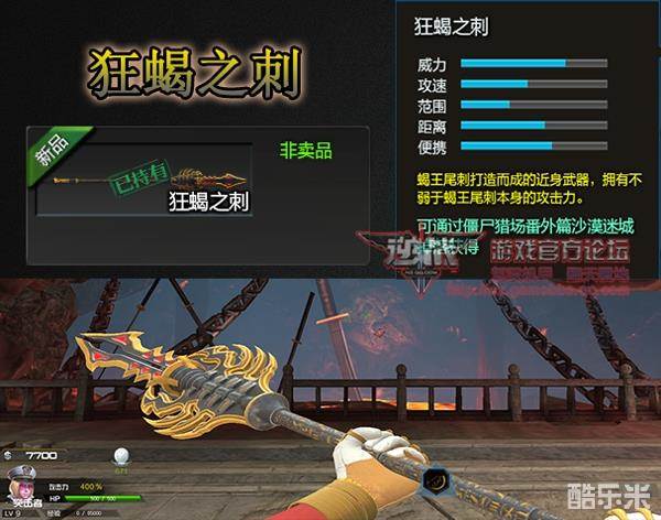 自然魔蝎大帝也会掉落其专属武器,狂蝎之刺作为蝎王尾刺打造而成的武器,伤害力当然不容小觑。不过从外观来看还真是蛮贴合这把武器的名字的(枪口处的蝎子造型真心唯妙唯俏),唯一的缺憾就是没有闪亮亮的特效。