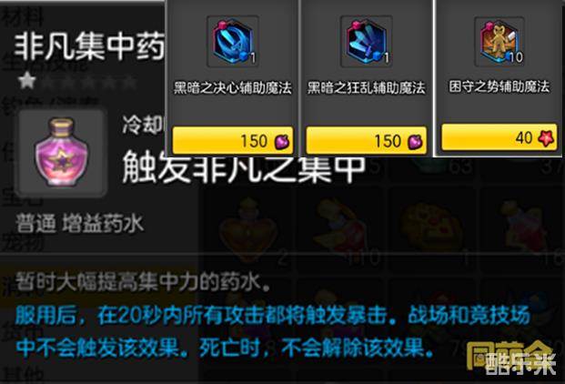 1.buff药或增伤药:满buff自然是必备,各职业增伤技能自然也不能少,如侠盗金钱盾、狂战士黑暗气息等,除此之外还有暗流药水:黑暗之决心辅助魔法(50%伤害)、黑暗之狂乱辅助魔法(50%攻速)也包括固守药水和一定不能缺的暴击药,暴击药在20秒内100%暴击,算上刷分关有24秒的时间,所以在暴击持续时间内的爆伤收益极高,并且依靠爆伤能刷出更多数量的怪物,所以在这里首先推荐更换爆伤披风和腰带,两件几百万即可搞定。