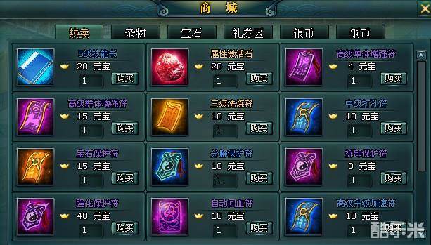 其四:打副本的时候,很多时候差一口气就可以过了,可以使用礼券购买高级群体增强符和高级单体增强符,因为是自己使用,所以用礼券购买即可,元宝可以购买强化保护符。