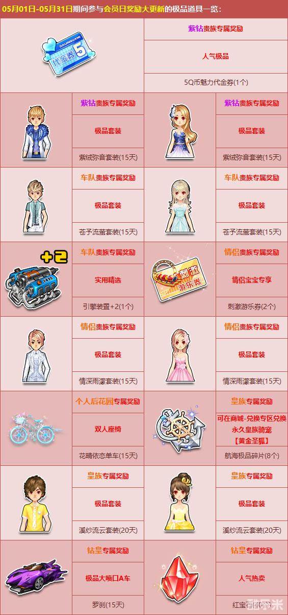 贵族专享特别福利,让你秀出体验优越身份!QQ飞车5月极品狂欢,每月1日为飞车【会员日】,魅力达人-特权感恩礼将每月1号定期更新!极品A车、极品道具、首发套装轻松领!