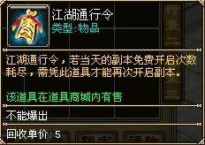 江湖通行令,当天副本免费开启次数耗尽,需凭此令才能再次开启副本。进入副本时消耗该物品道具。