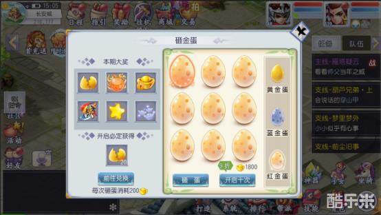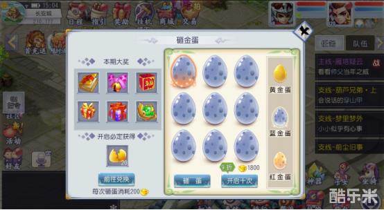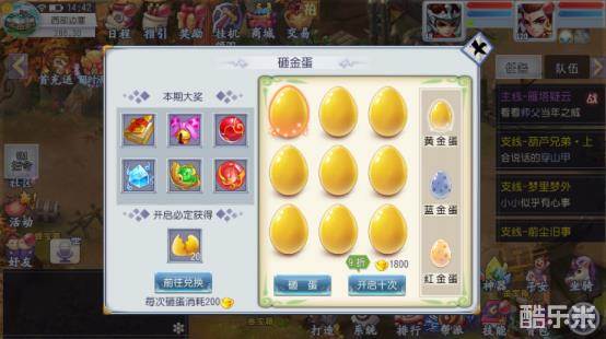 【活动说明】:通过主界面大入口进入,有三种不同模式的金蛋可供选择,不同的金蛋活动奖励不一样,其中包含仙兽宠物装饰、特殊宠物技能书、神兽宠物装饰、110级装备打造礼包等,玩家可以按照不同的奖励来挑选。每次砸蛋固定产出金蛋碎片,碎片可兑换大娃种子、砸蛋专属称谓、变异丹以及紫色元灵等等。