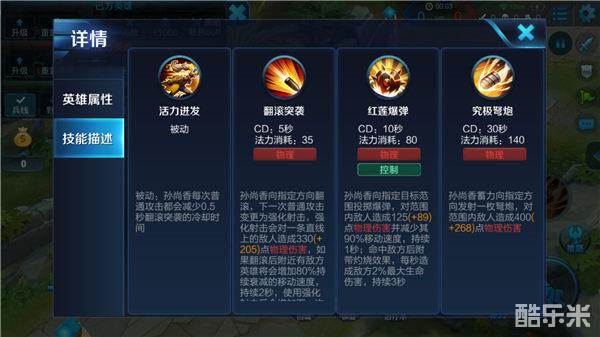 最后编辑于7年前孙尚香可以说是射手中最灵活的一个,通过一技能不断的翻滚可以远程POKE敌人,装备成型后的孙尚香可以打出成吨的输出。当前版本中射手普通伤害略低,孙尚香需要依靠一技能来打伤害,对于翻滚方向和距离需要拿捏的恰到好处。