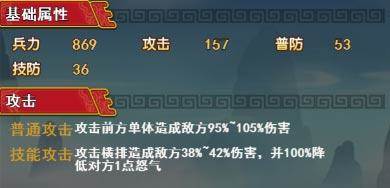 技能攻击:攻击横排造成敌方38%~42%伤害,并且100%降低对方1点怒气。
