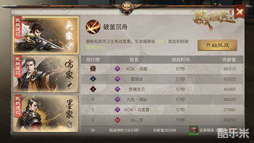 百家争鸣的人物具有一定的挑战性,建议将军邀请多人人组队参加。如在兵家挑战中,对手将由秦国大将蒙毅率领,这是个非常考验队伍中输出与治疗角色的副本。因为蒙毅生命值每降低20%,他与身边侍卫的攻击和防御则提高20%。因此各位将军需要快速击败蒙毅,防止残血时被其反杀。