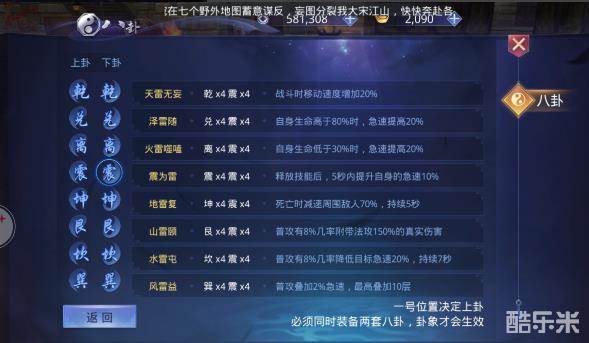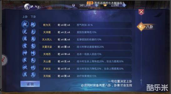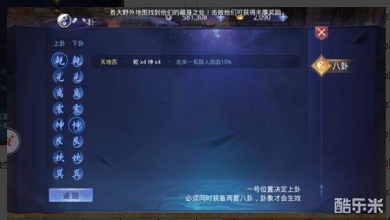 一号位置决定上卦、必须同时装备两组四件套八卦,卦象才会生效,共有 64种不同的卦象加成。