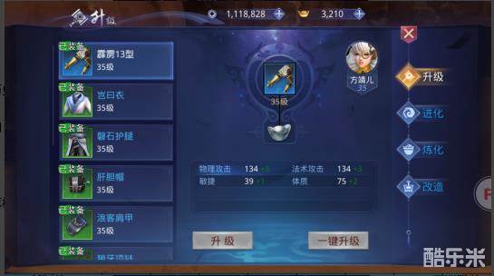 而后装备除了纵向的升级养成外,还有横向的装备进化,通过消耗材料补天石,装备科完成进化,同时装备进化的等级也受到了玩家最高等级的限制。