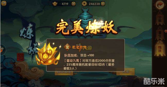 除了前往桃源界抓符鬼,就是在炼化界面直接炼妖了。桃源界每次抓符鬼消耗2点耐力,几率抓到只有自己能看见的专属符鬼,可以抓到蓝色和紫色品质的符鬼,失败也可以继续抓。炼妖需要伙伴和妖灵石,不同品质的伙伴和妖灵石搭配,合成的符鬼概率也不同,基本上橙色伙伴加上蓝色妖灵石就有20%几率出橙色伙伴了。