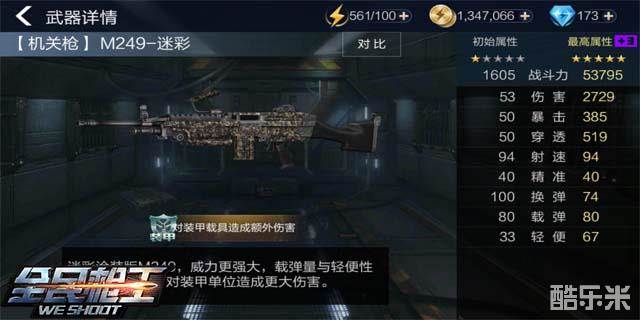 这把枪同样是机关枪,它就有机关枪的特点了,它的基础属性同样处于金字塔顶端,80发的子弹,虽然初始伤害不是很高,只要将枪械培养起来,它同样会成为一把威力惊人的武器。到了最高属性,综合战力能达到同样的五万多,并且伤害能达到两千多。并且它的轻便也会大大提升,更方便使用这把机枪。