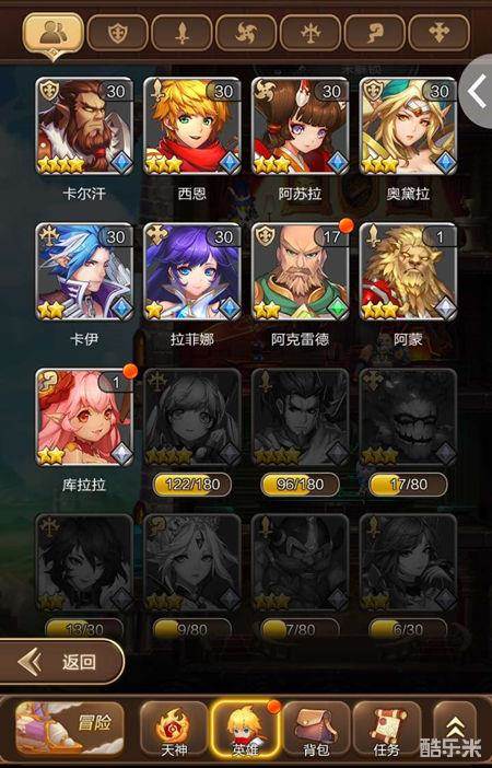 英雄系统的界面可以通过点击游戏底部菜单中的“英雄”按钮进入,头像框亮起的英雄表示你已经收集了该英雄,未亮起的英雄则表示还未收集。头像框显示的信息包括英雄形象、名称、职业、等级、星级和品质,还未收集的英雄会在头像下方显示收集进度(已有英雄之魂/召唤所需)。