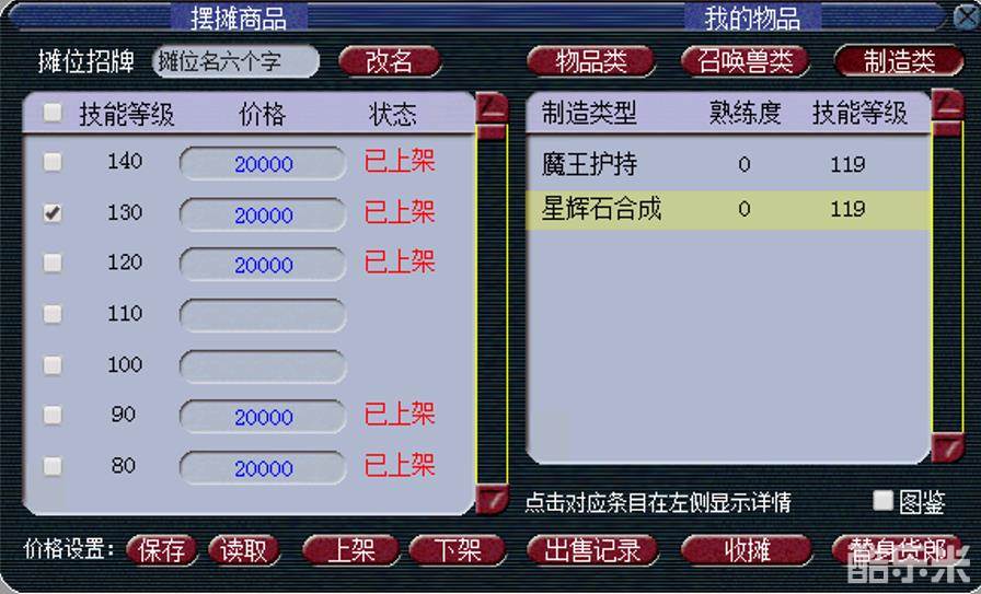 1. 使用鼠标左键点击界面右侧的摆摊制造类,界面左侧在需要上架的项填入价格,再选中勾选框,然后点击上架(下架)按钮,即可进行上下架操作。