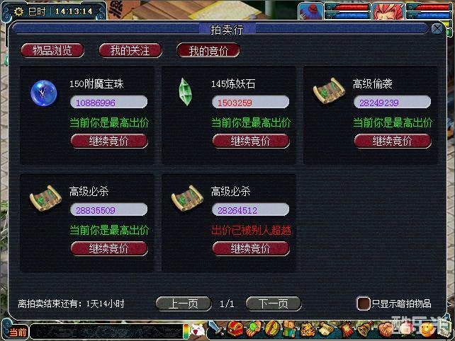 4、拍卖结束后,可在NPC拍卖使者处查看各拍卖物品的最终成交价。赢得拍卖物品的玩家会收到系统邮件,需要在下次拍卖会开启之前,前往长安城(214,12)的拍卖保管员处完成“金钱结算”,多退少补。请务必在下次拍卖会开启之前取出赢得的拍卖物品和退还的金钱,否则将会被系统回收。