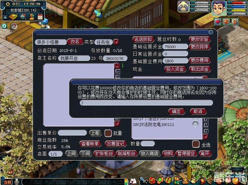 商店开张后,将按照每间普通柜台每天50000两×相应种类商业指数,每间物品收购柜台每天75000两×物品类商业指数来交纳基础维护费用,在营业的情况下,每间普通柜台每小时会加收基础营业费用×相应种类商业指数和每间物品收购柜台每小时会加收1.5×基础营业费用×物品类商业指数的维护费用。其中基础营业费用最低值为1800,最高值为10000。店主可以随意调整其商店的基础营业费用,调整在每天商会维护完成后起效。