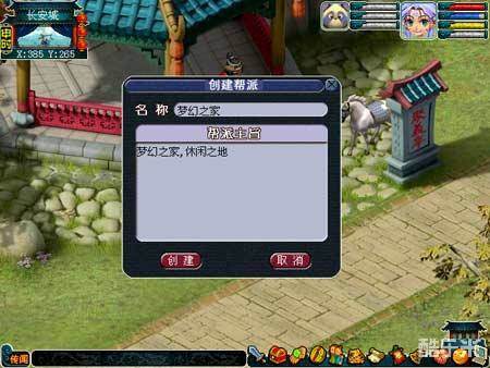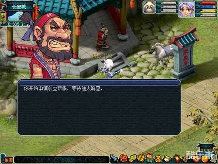 申请步骤:找到“帮派主管”对话,选择“新建帮派”,输入帮派的名称(最多七个汉字)和宗旨,再点“确定”即可,需要花费的申请费用在现金中扣除。申请后需要等待其他玩家响应,要求响应者等级≥20。响应人数达到10的时候帮派建立成功,申请者成为帮主,响应者成为帮众。