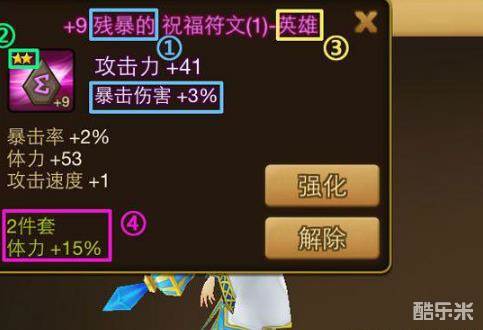 ①、表示符文的类别,是附加属性,如上图残暴的则对应下面的暴击伤害+3%,这个类别在强化过程中有可能会出现;