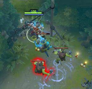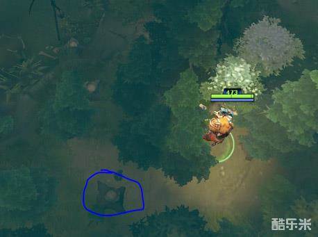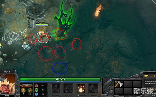首先要砍掉6棵可爱的小树! 哪六颗我已经用红笔圈起来了! 那么你们一定会问那颗蓝色的是神马东东! 我要说 那颗很重要,是藏人的地方,野怪在出兵30秒的时候会刷新,这个时候要注意了 一定要躲到蓝色的地方 不然你会人工封野导致脸一黑全面崩盘!打野巨魔非常注意这点细节 一个失误你的装备可能就要多等好几分钟了