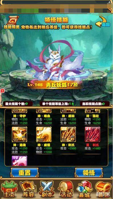 在游戏内有比较常见的两种思路:第一,追求战力追求排行榜的玩家,如果对宠物攻击不是十分在意,可以以洗技能羁绊为主,如下图所示。追魂、强壮、感知、嗜血、守护,锁了这五个技能羁绊简单粗暴,多余的一个锁定位给金利爪。剩下的三个位置洗的技能,找最后那个加攻击的威慑和红的利爪,出现这两个基本就可以毕业了,最后一个技能差不多也就行了。