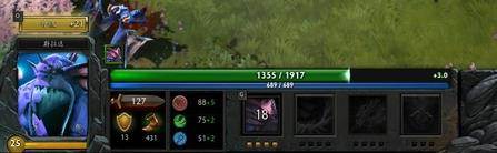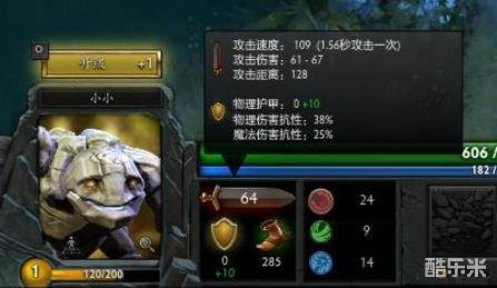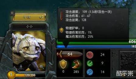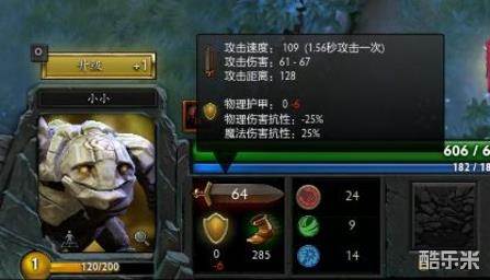 那么当护甲为负的时候这个公式是否依旧有效呢。我们继续进行测试。当无装备的小小身处影魔减甲光环中时,面板护甲显示为-6,面板减伤显示为-25%。将护甲值绝对值代入公式计算得物理抗性为25%,因为护甲为负,效果由物理减伤变为物理伤害加深。
