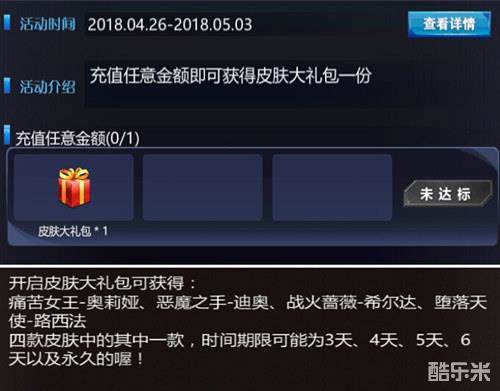 活动内容:活动期间玩家充值任意金额可获得皮肤大礼包一份