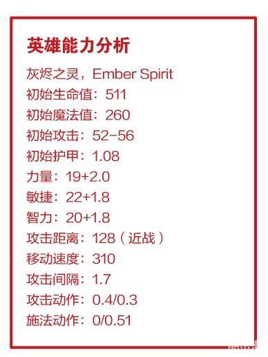 灰烬之灵作为名敏捷英雄,敏捷成长和护甲值却低的可怜,实在没有这类英雄应有的做派,除了鱼人夜行者之外,敏捷最差的敏捷英雄就要属灰烬之灵了。当然,这类属性奇葩的英雄我们也已经见怪不怪了,真正决定着英雄实力强度的只有技能。灰烬之灵作为一名靠技能吃饭的敏捷英雄,不会有多少人去在惫他的属性高低的。值得注意的是,灰烬之灵的施法前摇为0,比起影魔、撼地神牛这些英雄来说,在使用技能时有着不小的优势。