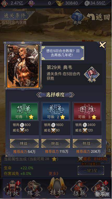 在挑战副本时我们会发现,每一个副本都会有3种难度供玩家进行选择,不同难度对应不同星数且含有推荐战斗力,对没错,这里的星数即使选择Buff加成时可以消耗的星数。而且不同组的副本通关条件也并不相同,并不是所有副本战斗胜利就算通关的。