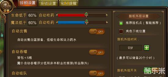 1.大于60级的玩家下线前可以打开“挂机设置”面板进行离线挂机的设置。您可以设置角色自动吃药与自动买药,让您在挂机过程中安全无虞;您还可以开启自动拾取,这样就不会错过挂机时掉落的好装备啦;当然,您还可以设置自动出售与自动吞噬,不用担心因为背包满了而无法拾取呦;最后,您还可以开启自动组队,大大滴提高挂机效率!