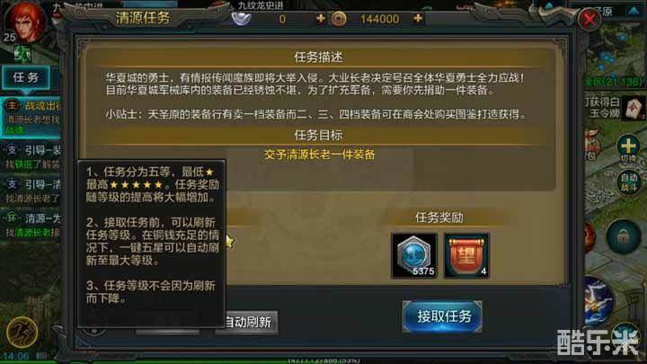 在选择好职业后进入游戏,1级主角的出生地在北郡,北郡也就是新手村,这时候开启第一章的剧情任务“三月无雨旱风起,重回华夏战女魃”。在北郡可以接取1-6级的主线任务,主线任务以介绍游戏世界观和新手操作引导为主,从第一个任务是“北郡惊梦”开始,一直到“意外遭遇”结束了北郡的主线任务。玩家只需要根据任务指引去做即可,完成任务就可以很快的将等级提升到6级,6级以后进入下一个区域。