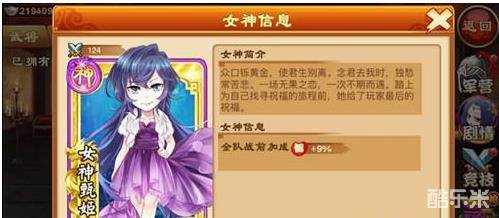 女神貂蝉开场增加智力9%,攻击9%,血量10%,属性最强,完美通用,而且是唯一的增加3属性的女神,绝对适合于所有纯系及混搭系队伍。