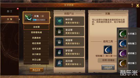 游戏中,玩家们可上线手动采集,以更快的速度获得材料,当然也会损耗采集工具的耐久度,而离线采集不会消耗工具,但是要玩家自己设定场景采集,效率相对手动采集有所下降。