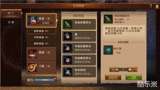 在采集到足够的材料后,玩家们可以直接点合成按钮传送到生活师傅那边进行制作。部分高等级生活制作,需要在商城或者世界boss掉落中获得相应的制作配方,配方使用过后,玩家在达到相应等级自动会开放该制作技能。值得一提的是,制作消耗品需消耗一定的体力,体力可以通过体力药水或者完成试炼内任务获取活跃度恢复。
