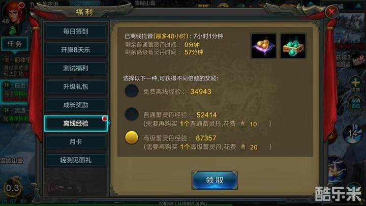 在福利系统中有意离线经验领取,在离线的时候可以进行托管,系统会自动储存一部分离线经验。离线经验最多存储48小时,也就是2天的时间,我们可以选择三种方式获得不同倍数的离线经验,直接免费领取离线经验、使用普通蓄灵丹获得经验、使用高级蓄灵丹获得经验,蓄灵丹需要花费文钱购买。
