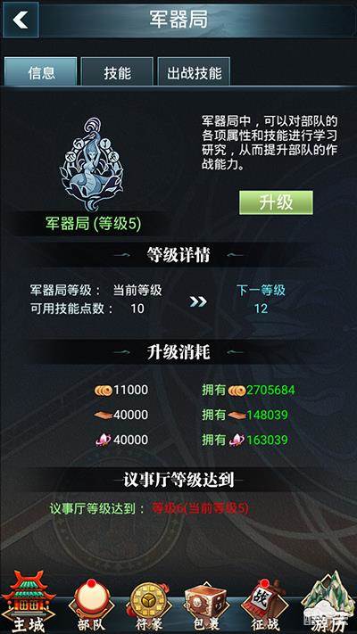 军器局,可以对部队的各项属性和技能进行学习研究,从而提升部队的作战能力。在信息栏中,可以查看当前的建筑等级、可用技能点数和升级消耗等信息。技能分为土、火、水、木四种属性,下方有着各式各样的技能,还需主公利用自己的聪明才智合理分配加点。技能栏右上方提供重置点数的功能,只需花费50黄金即能重置已使用的技能点数,完全不用担心点错不能重来。最右侧则为出战技能的配置栏,可在此界面配置主动战斗技能,防御战斗技能,和游历技能,加了技能点可别忘了到该界面配置哦!